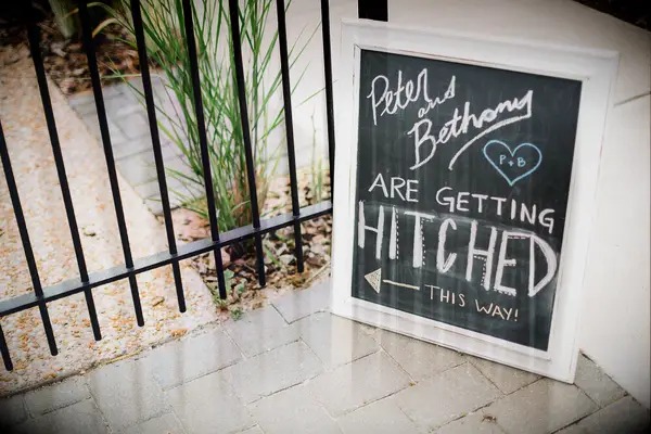 Foto: Los Brauns For at hilse deres gæster havde dette par et Bryllup velkomstskilte Ved indgangen til deres ceremonielle rum. Denne tabel over tabellen er sød, mens det er en retning for dem, der ankommer.