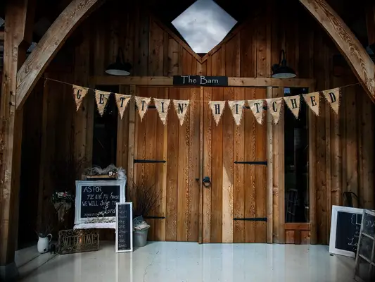 Fotos: Caity McCulloch -fotografer I stalden på stalden blev et Getttin -banner hængt op ved indgangen til receptionen. Brudens mor var i stand til at finde den anvendte dekoration.